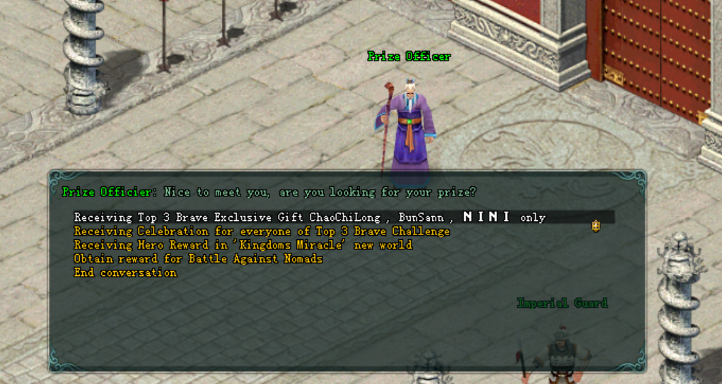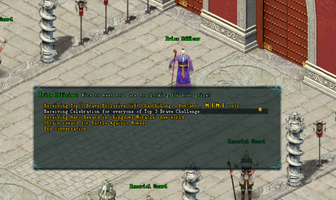- តម្រូវអោយអ្នកកម្សាន្តទៅជួបជាមួយ: NPC Prize Officer ដែលមាននៅក្រុង BianJing ChengDu QuanZhou