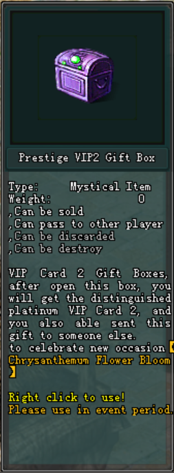 - បន្ទាប់ពីបើក "Prestige VIP2 Gift Box" ជាលើកដំបូងនឹងទទួលបាន "VIP Card 2" ហើយនិងរង្វាន់.