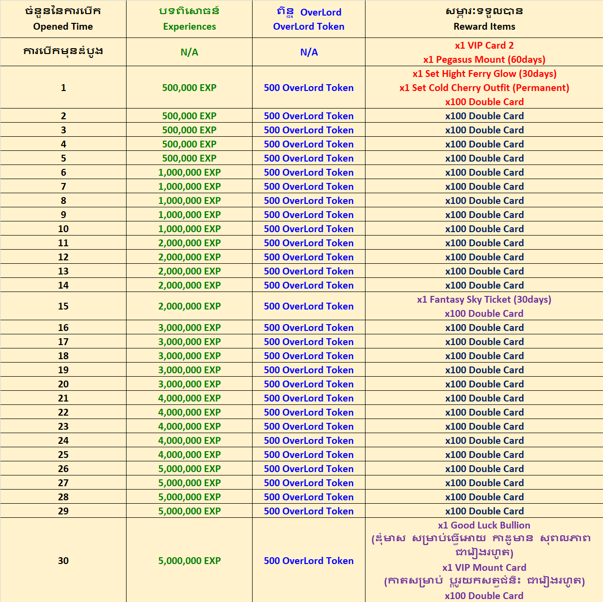 - កាលបរិច្ឆេទសម្រាប់ "VIP Card 2" មានសុពលភាពត្រឹមតែ 60 ថ្ងៃប៉ុណ្ណោះ។