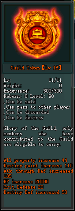• Title សម្រាប់ Guild's Leader, A.Leader, Elder: No.1 Overlord (All Property 20 / Ex.&In Atk 6% / HP Increase By 10000 / រយះពេល 24ម៉ោង)