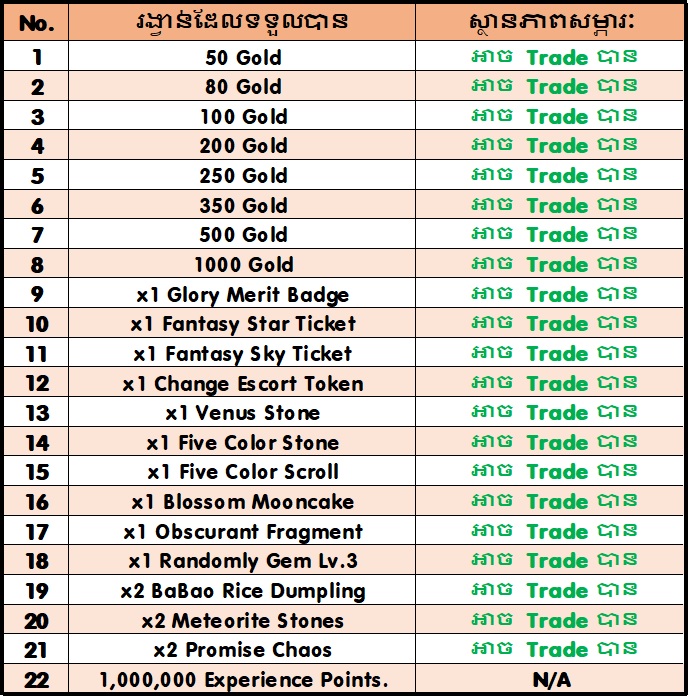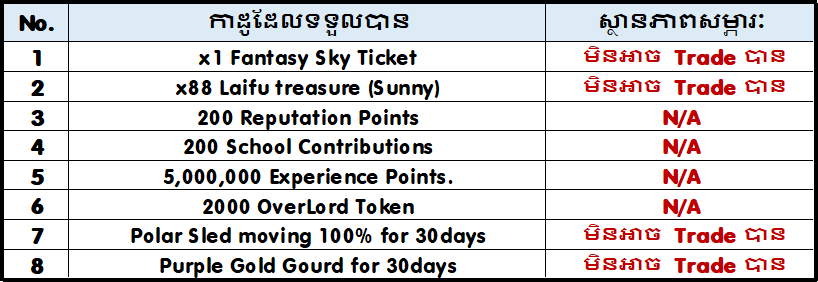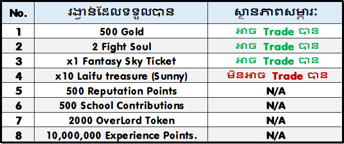- រាល់តួអង្គដែលបានចូលរួមព្រឹត្តិការណ៍នេះហើយរើសបានគ្រប់ចំនួន 200 ប្រអប់ នឹងទទួលបានរង្វាន់ដូចខាងក្រោម៖