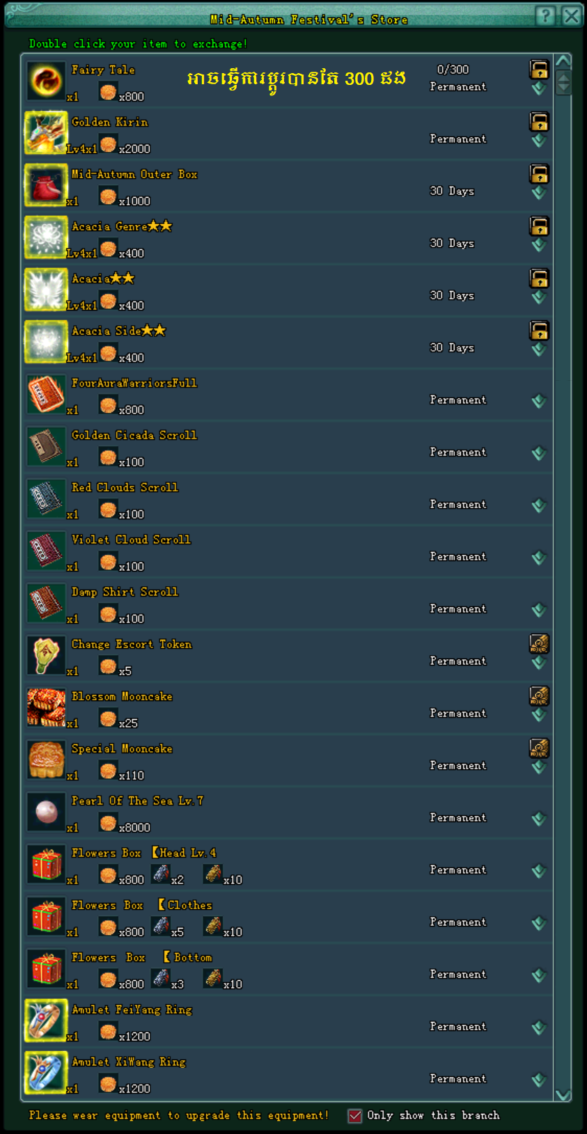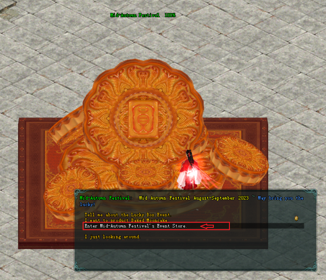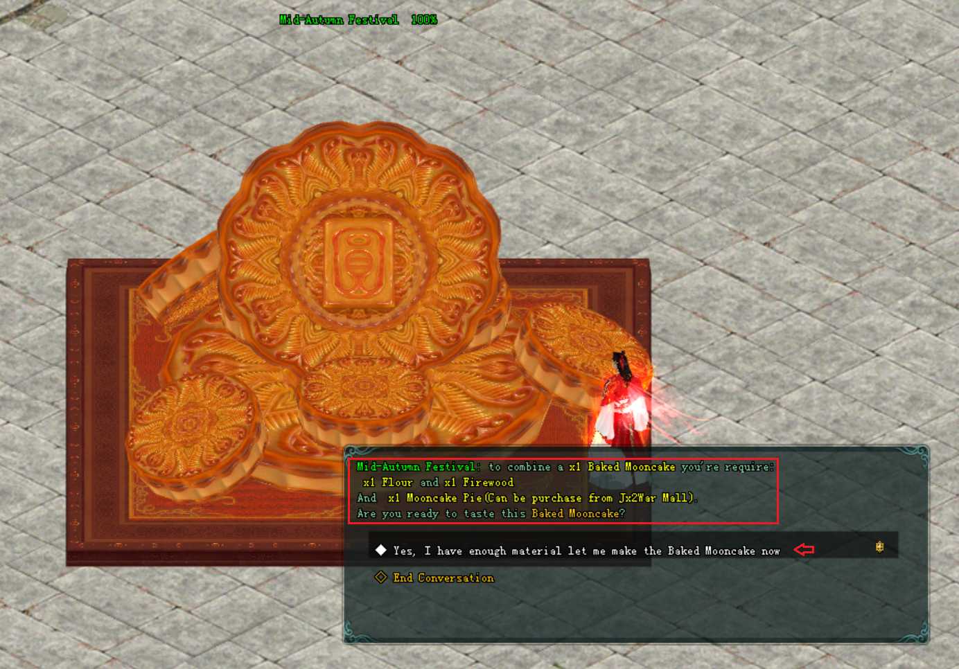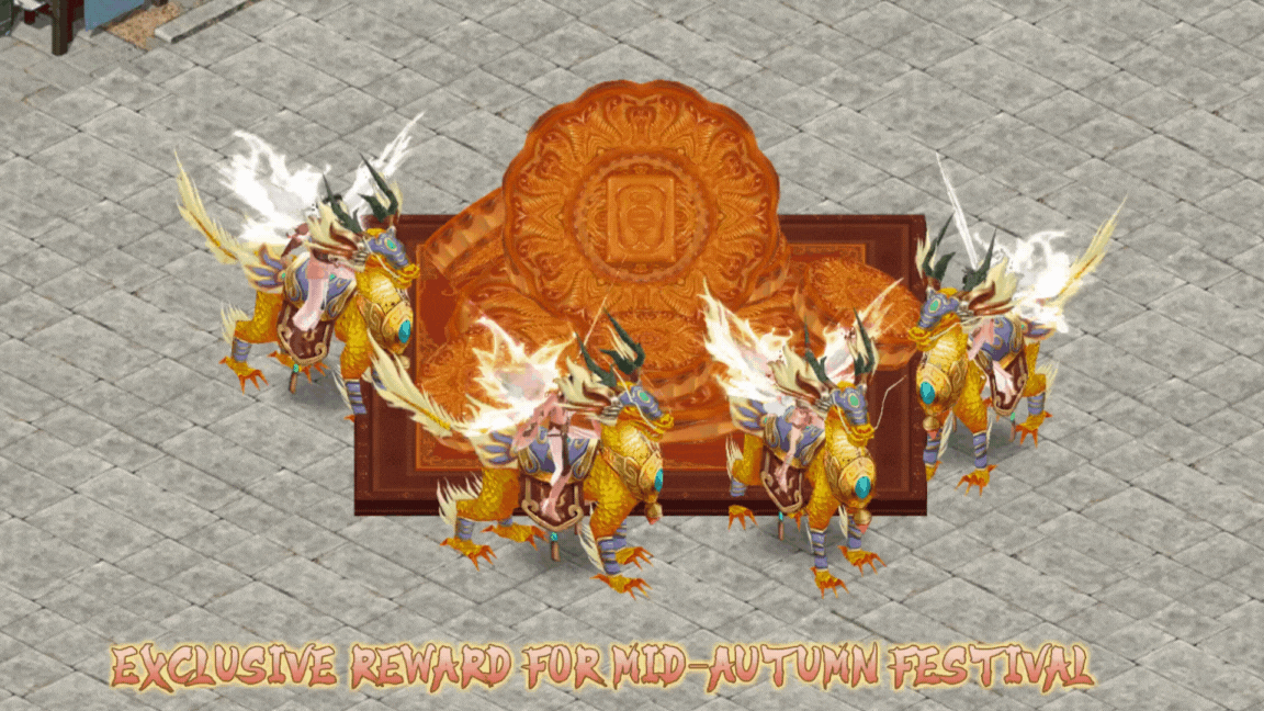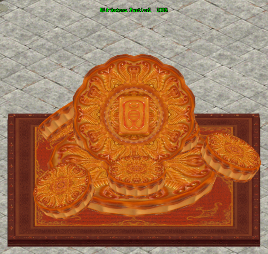- អ្នកកម្សាន្តតម្រូវអោយទៅកាន់ទីក្រុងធំៗមានដូចជា៖ BianJing, ChengDu, QuanZhou ហើយធ្វើការស្វែងរកនូវ Mid-Autumn Festival NPC ដែលមានរូបរាង ជានំសែនព្រះខែធំ ដែលនៅចាំកណ្ដាលក្រុងនីមួយៗខាងលើ៖