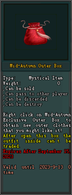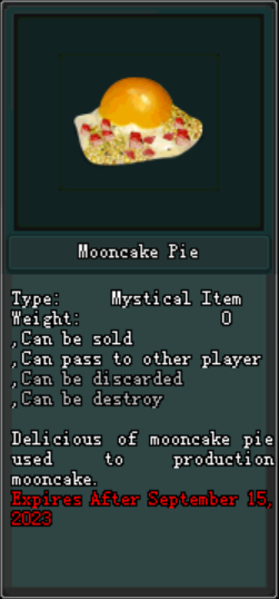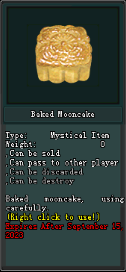 ក្រោយពេលការធ្វើបច្ចុប្បន្នភាព Version 1.0.6 រួចមកអ្នកកម្សាន្តដែលធ្វើការ ចូលរួមព្រឹត្តិការណ៍កំចាត់មេនិងទទួលបាន Mooncake Material នៅពេលដែលអ្នកកម្សាន្តទទួលបាន កញ្ចប់ Mooncake Material អ្នកកម្សាន្តអាចបើកវាបាននិងទទួលបាននូវ សម្ភារៈដើម្បីផលិតបាននូវ Baked Mooncake ដែលនៅក្នុងនោះរួមមាន : Flour នឹង Firewood Random តិចនឹងច្រើនហើយ