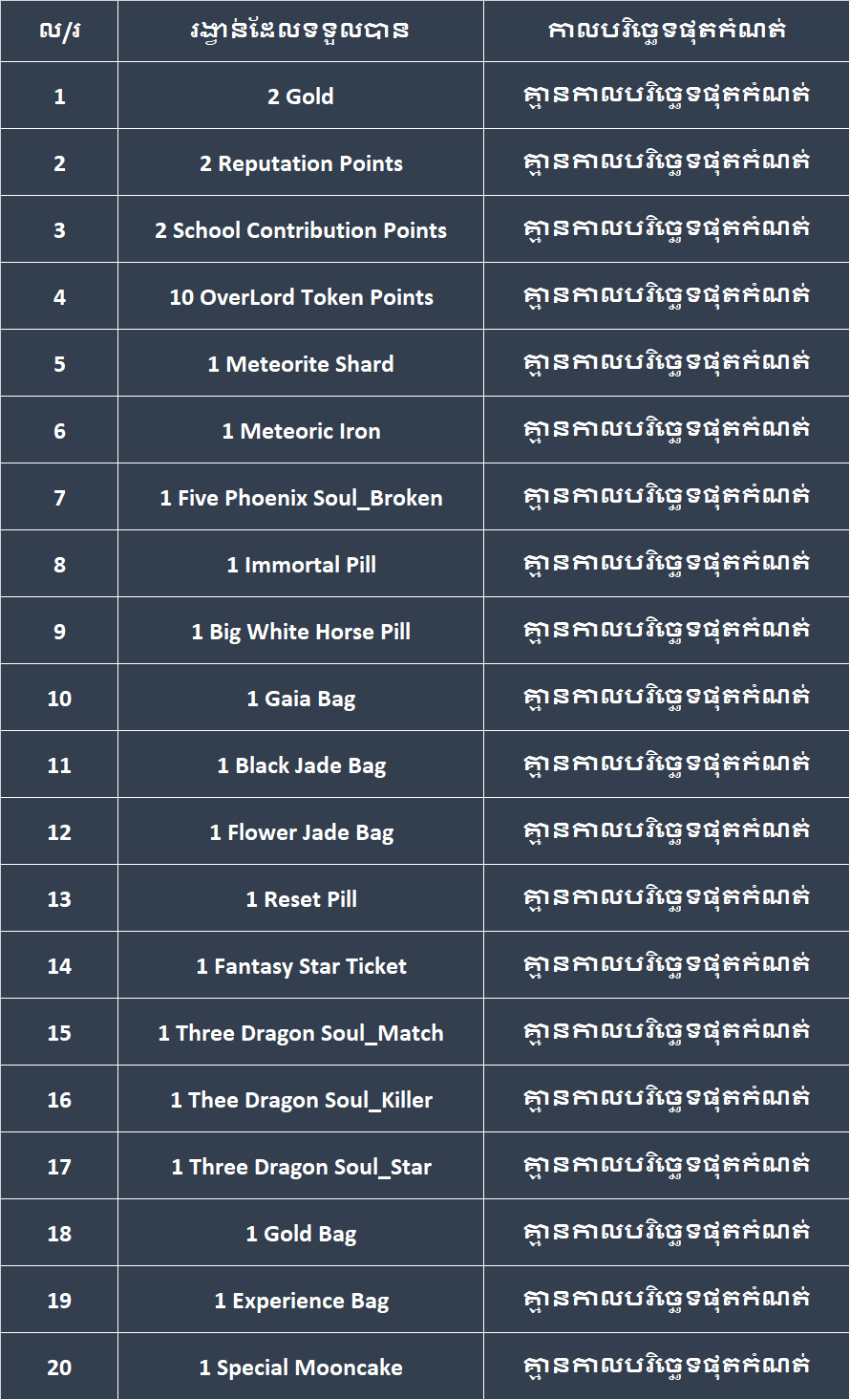រង្វាន់ដែលទទួលបាន ភ្លាមៗរួមមាន: 1,000,000 EXP | 500 OverLord Token | x10 Mid-Autumn Mooncake