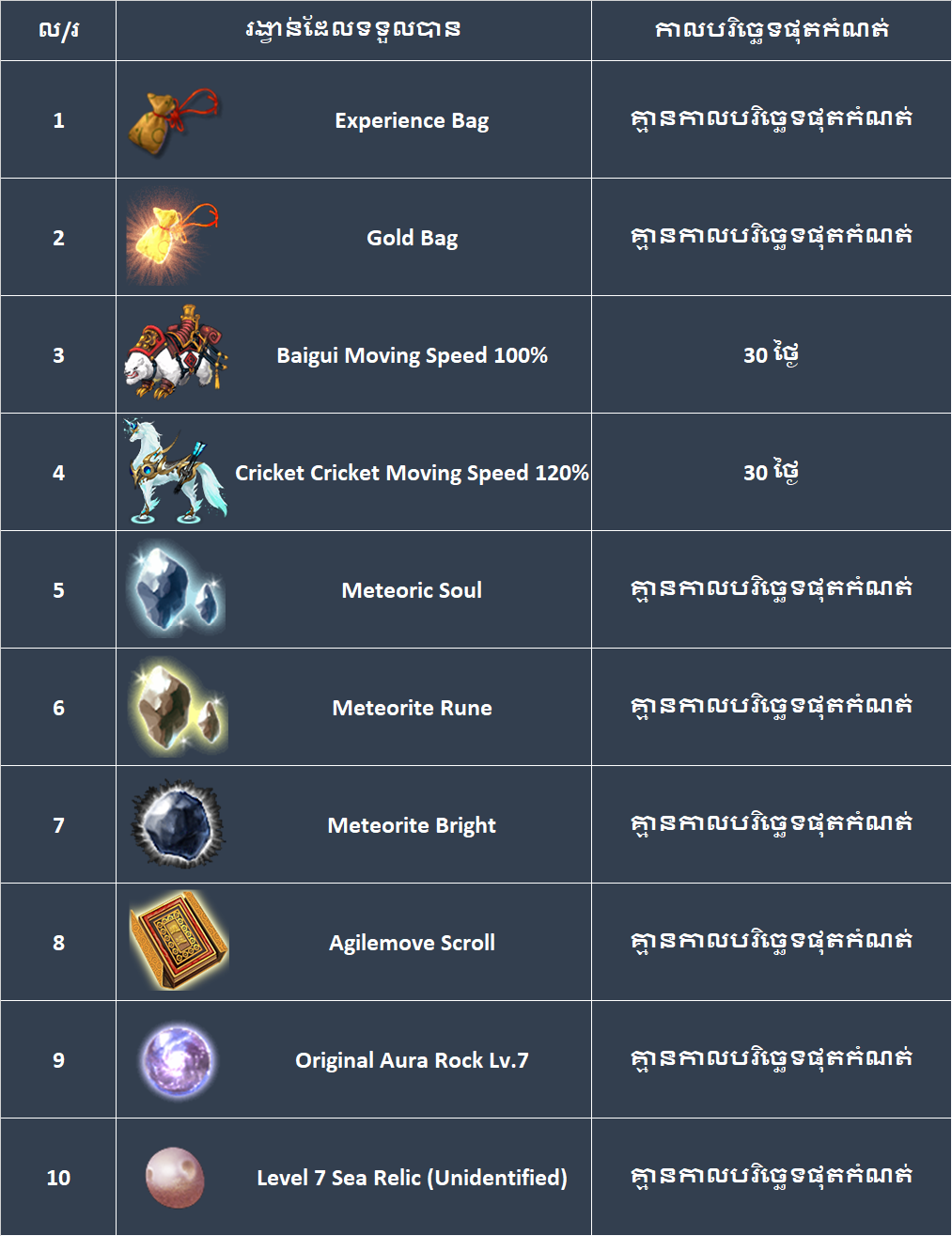 និងរង្វាន់ Random ក្នុងតារាងខាងក្រោម: