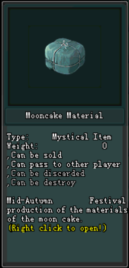 - នៅពេលអ្នកកម្សាន្តបើក Mooncake Material អ្នកកម្សាន្តនិងទទួលបានវត្ថុធាតុដើម