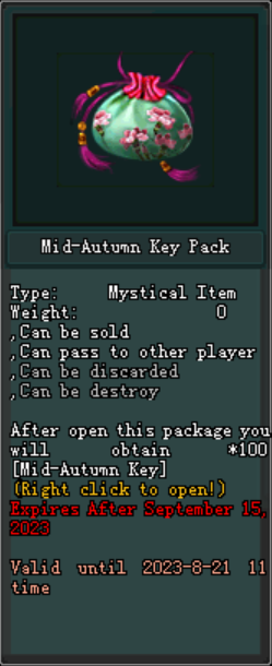 - Mid-Autumn Key Pack អាចរកទិញបាន ក្នុងតម្លៃ 89 Jpoints បើកទទួលបានចំនួន x100 Mid-Autumn Keys ។