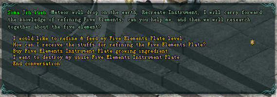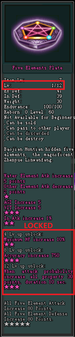 - The Five Elements Plate can be enhanced +0 to +15 by using M.Shards, M.Iron & M.Stone at Liu the Ironsmith XiangYang 177 / 183.