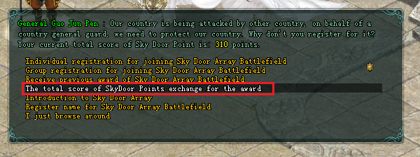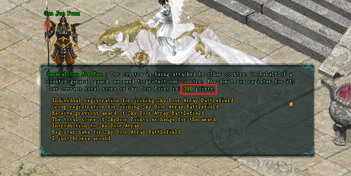 • When you gain enough level 70 or above you will get instructions guiding to Sky Door Battlefield by visiting NPC Gun Jun Peng located at XiangYang (178/176) to join the Sky Door Array Battlefield.