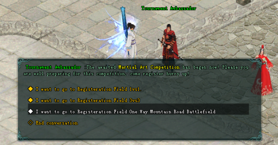 អ្នកកម្សាន្ត អាចទៅកាន់ផែនទី BianJing ដើម្បីស្វែងរក NPC Tournament Ambassador ដើម្បីចុះឈ្មោះ ។