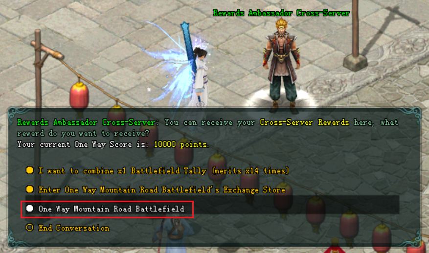- បន្ទាប់អ្នកកម្សាន្ត អាចត្រឡប់ទៅទីក្រុង BianJing វិញជួបជាមួយនឹង NPC: Rewards Ambassador Cross-Server (BianJing [175,174]) ដើម្បីយក Reward។