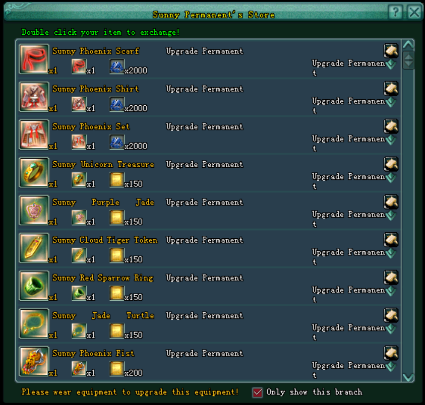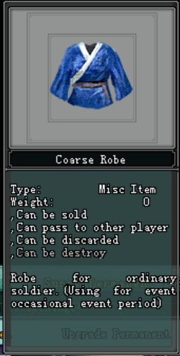 ● ក្នុងករណីអ្នកកម្សាន្តចង់ធ្វើការ Upgrade មួក អាវ ឬ ខោ Sunny អ្នកកម្សាន្តតម្រូវអោយធ្វើការស្វែងរកនូវ Coarse Robe ចំនួន 2000 ក្នុងការប្ដូរសម្ភារៈអោយបាន 1មុខ ដែល ទទួលបានមក ពីការសម្លាប់ខ្លាឃ្មុំភ្នំខ្មៅ(Mountain Bear) ដែលមានទីតាំងស្ថិតនៅ Luofu Mountain ដែលស្ថិតនៅ ខាងកើត ទីក្រុង QuanZhou (East Quanzhou)