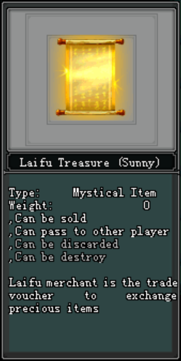 ● សម្រាប់អ្នកកម្សាន្តដែលចង់ធ្វើការ Upgrade Sunny Accessory ឬ អាវុធនោះអ្នកកម្សាន្តតម្រូវអោយមាន Laifu Treasure (Sunny) ។