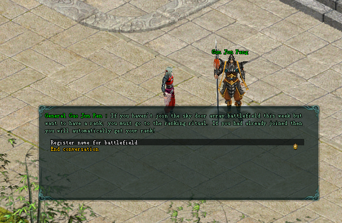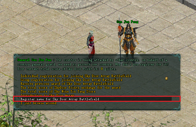 2. After entering the Sky Door Array Battlefield, go to the queue officer according to battlefield to start require for 8 people from each side, and maximum is 16 people for entire battlefield.