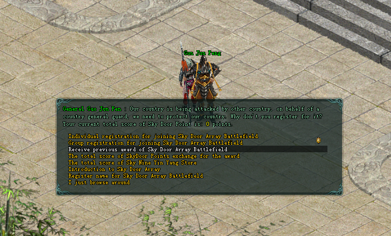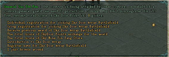 1. After the player reaches level 70, can go to the XiangYang Gun Jun Peng (XiangYang [178/175]) to register for the Sky Door Array Battlefield.