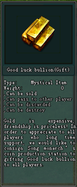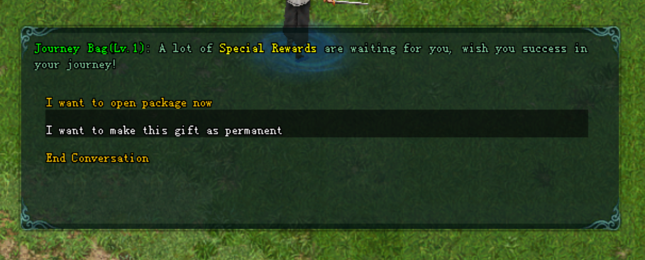 • នៅពេលដែលអ្នកមាន Good Luck Bullion ដើម្បីដំណើរការ Journey Bag អ្នកត្រូវចុច Mouse ខាងស្ដាំ លើ Journey Bag ហើយចុចលើ "I want to make this gift as permanent"។