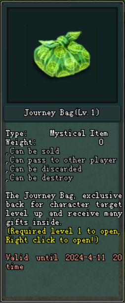 • Journey Bag ដែលអ្នកទទួលបាន មានកាលបរិច្ឆេទផុតកំណត់ 90ថ្ងៃ ប៉ុន្តែអ្នកអាចដំណើរការ Journey Bag ដើម្បីអាចប្រើ Journey Bag ជារៀងរហូត។ ទាមទារ អោយមាន Good Luck Bullion ដែលអ្នកកម្សាន្តទាំងអស់អាចទទួលបានពី "Dynasty VIP 1" ។