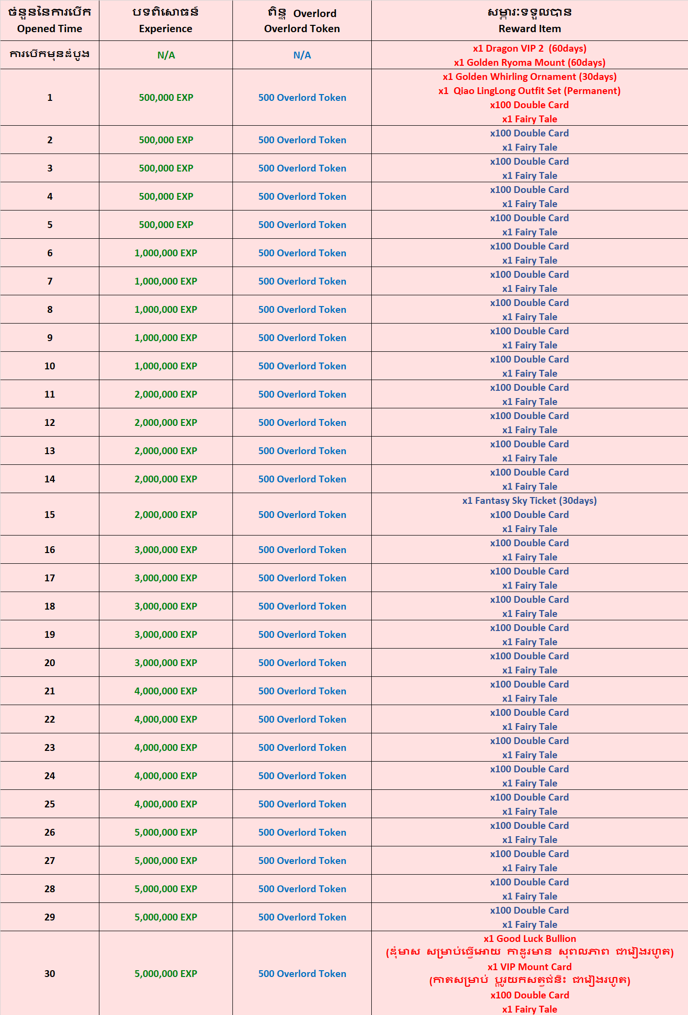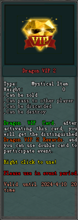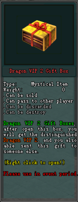 - បន្ទាប់ពីបើក "Dragon VIP 2 Gift Box" ជាលើកដំបូងនឹងទទួលបាន "Dragon VIP 2" ហើយនិងរង្វាន់.