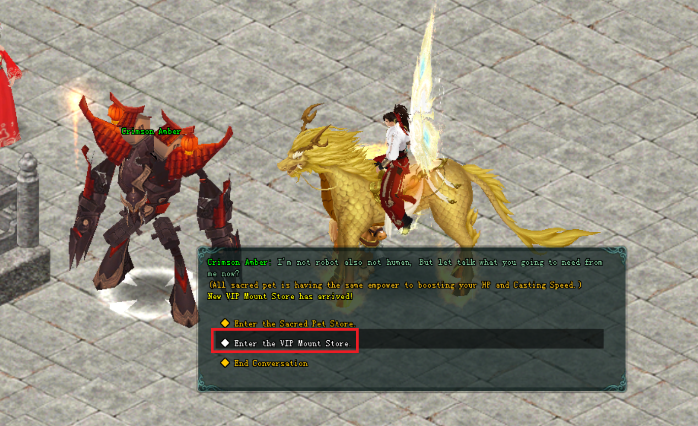 អ្នកកម្សាន្តអាចធ្វើការយក VIP Mount Card ទៅប្ដូរជាមួយ NPC: Chrimson Amber ដែលមាននៅគ្រប់ទីក្រុងទាំងអស់។