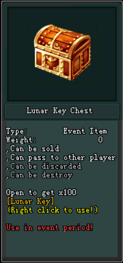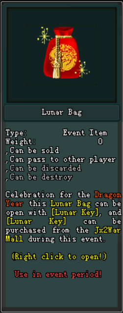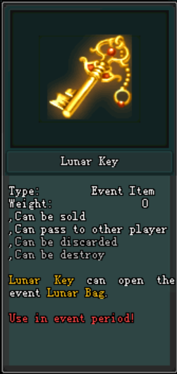 អ្នកកម្សាន្តអាចបើក Lunar Bag បានតម្រូវអោយមាន Lunar Key ចំនួន 1 បន្ទាប់ពីអ្នកកម្សាន្តបំបែក Lunar Bag នេះ នឹងទទួលបានភ្លាមៗ៖