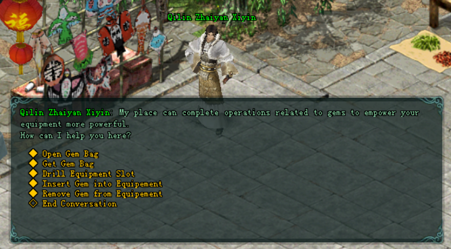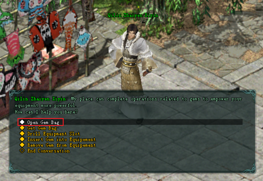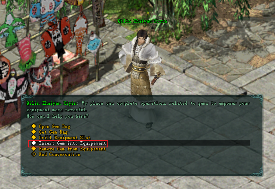 - សន្ទនាជាមួយ NPC Qilin Zhaiyan Xiyin រួចចុចជ្រើសរើស "Insert Gem into Equipment".