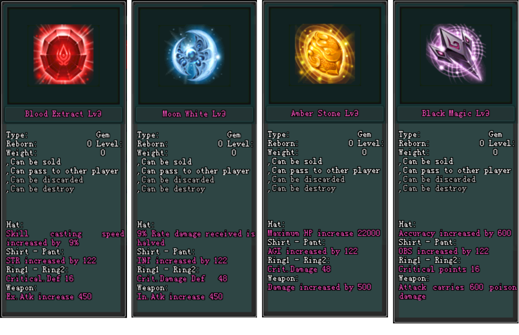 - ចន្លោះទី 3: តម្រូវអោយមាន 4 ប្រភេទ Lv.4 Gem Stones មួយមុខត្រូវមាន 4 គ្រាប់.