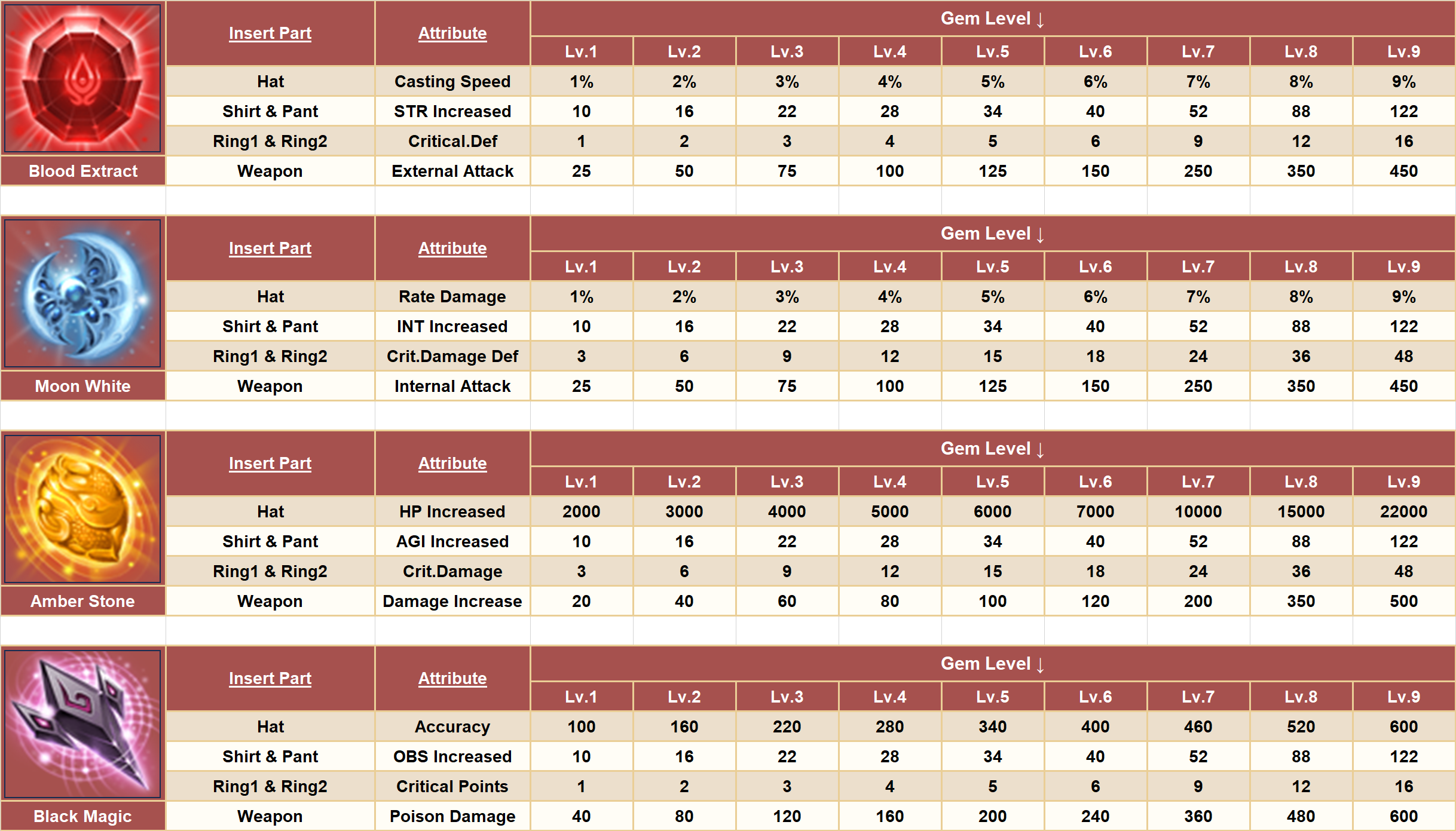 - ចន្លោះទី 2: តម្រូវអោយមាន 4 ប្រភេទ Lv.3 Gem Stones មួយមុខត្រូវមាន 3 គ្រាប់.