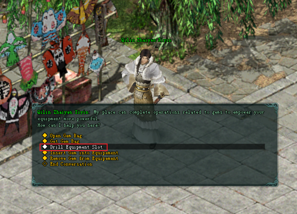 - សន្ទនាជាមួយ NPC Qilin Zhaiyan Xiyin រួចជ្រើសរើសយក "Drill Equipment Slot".