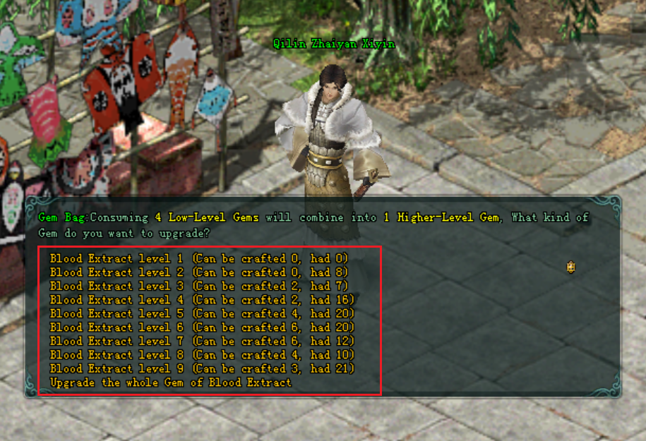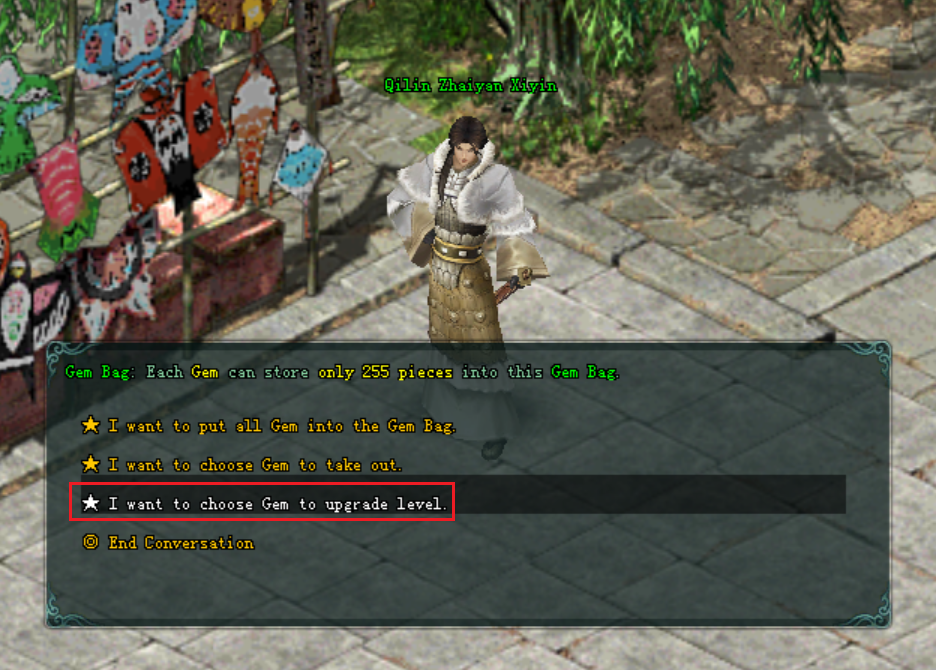 - សន្ទនាជាមួយ NPC Qilin Zhaiyan Xiyin ហើយជ្រើសរើស "Open Gem Bag" និង ជ្រើសរើសយក "I want to choose gem to upgrade level". (ក៏អាចធ្វើបែបនេះបានលើ Gem Bag បានដែរ)