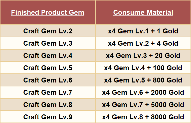 (ឧទាហរណ៍: តម្រូវការ ចំណាយ Gem Lv2 ចំនួន4គ្រាប់ សម្រាប់ផ្គុំ Gem Lv3 1គ្រាប់ )
