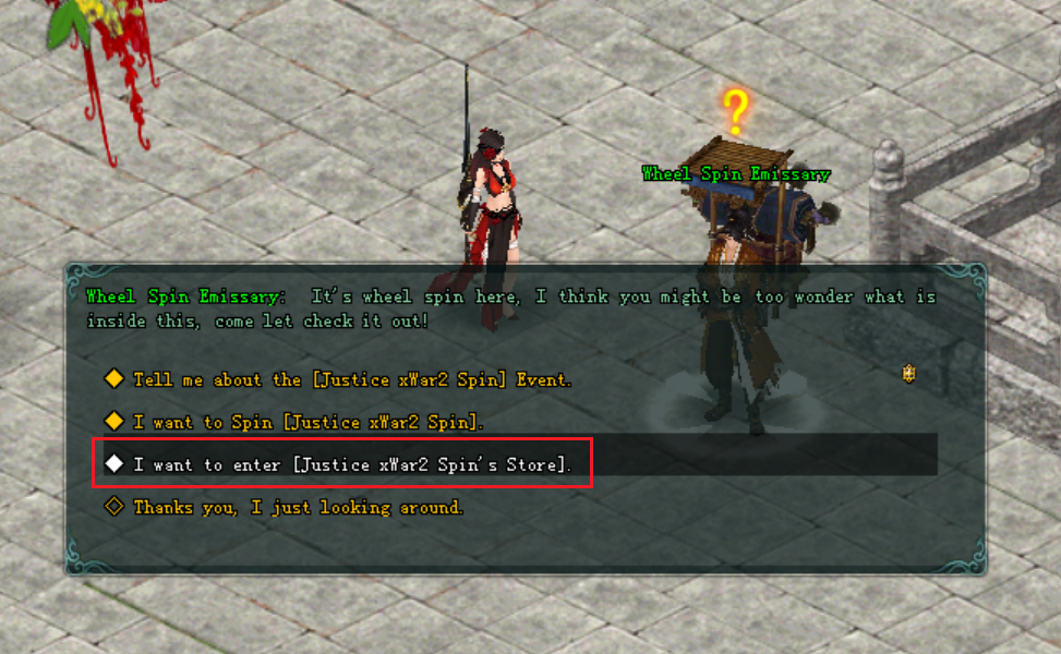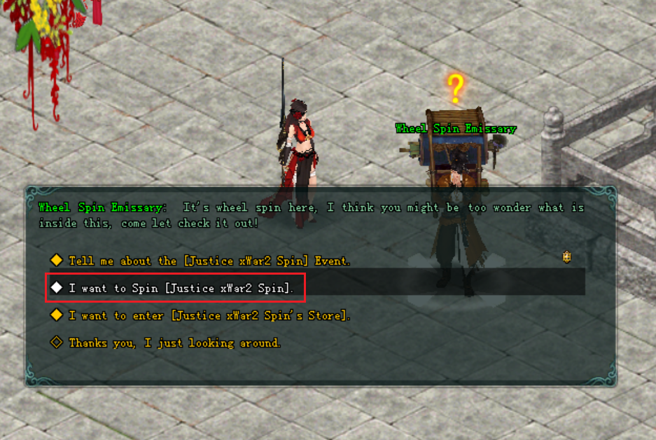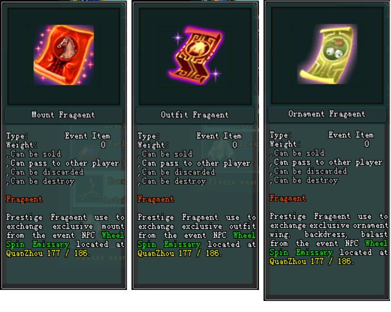 NPC ៖ Wheel Spin Emissary ដែលមានទីតាំងស្ថិតនៅទីក្រុង QuanZhou 177 / 186 ។