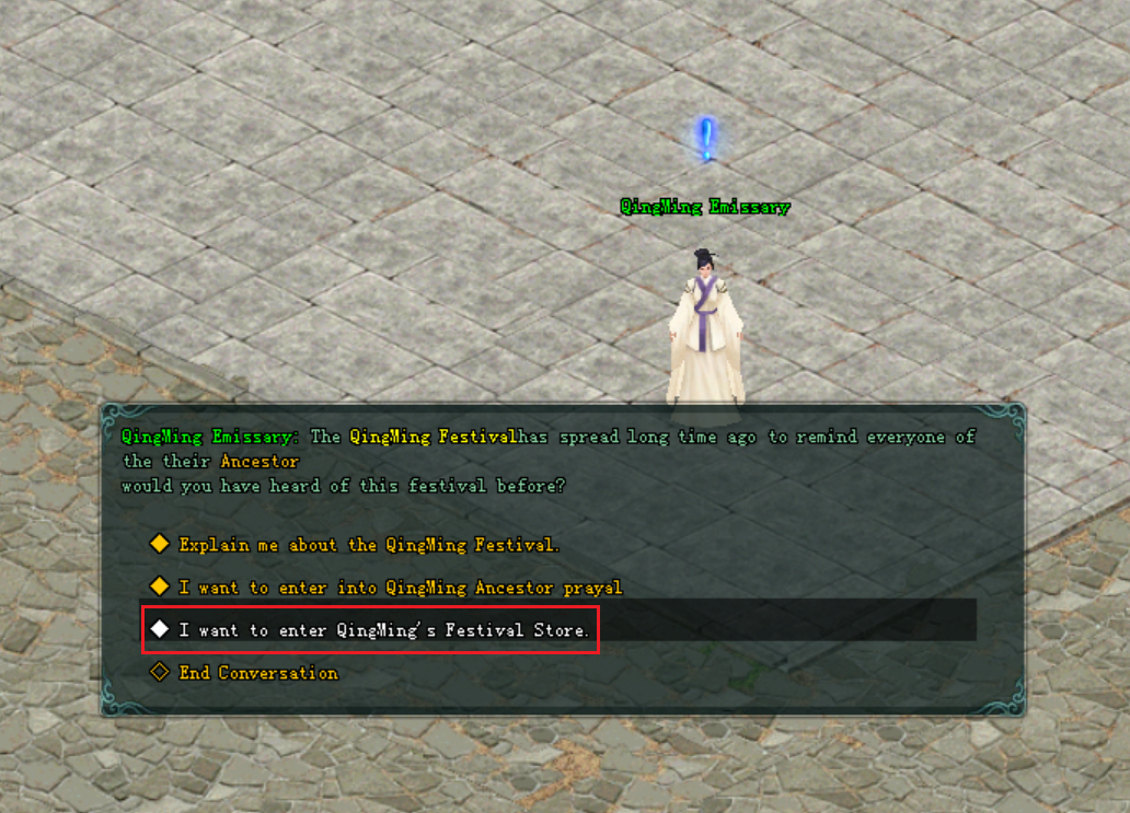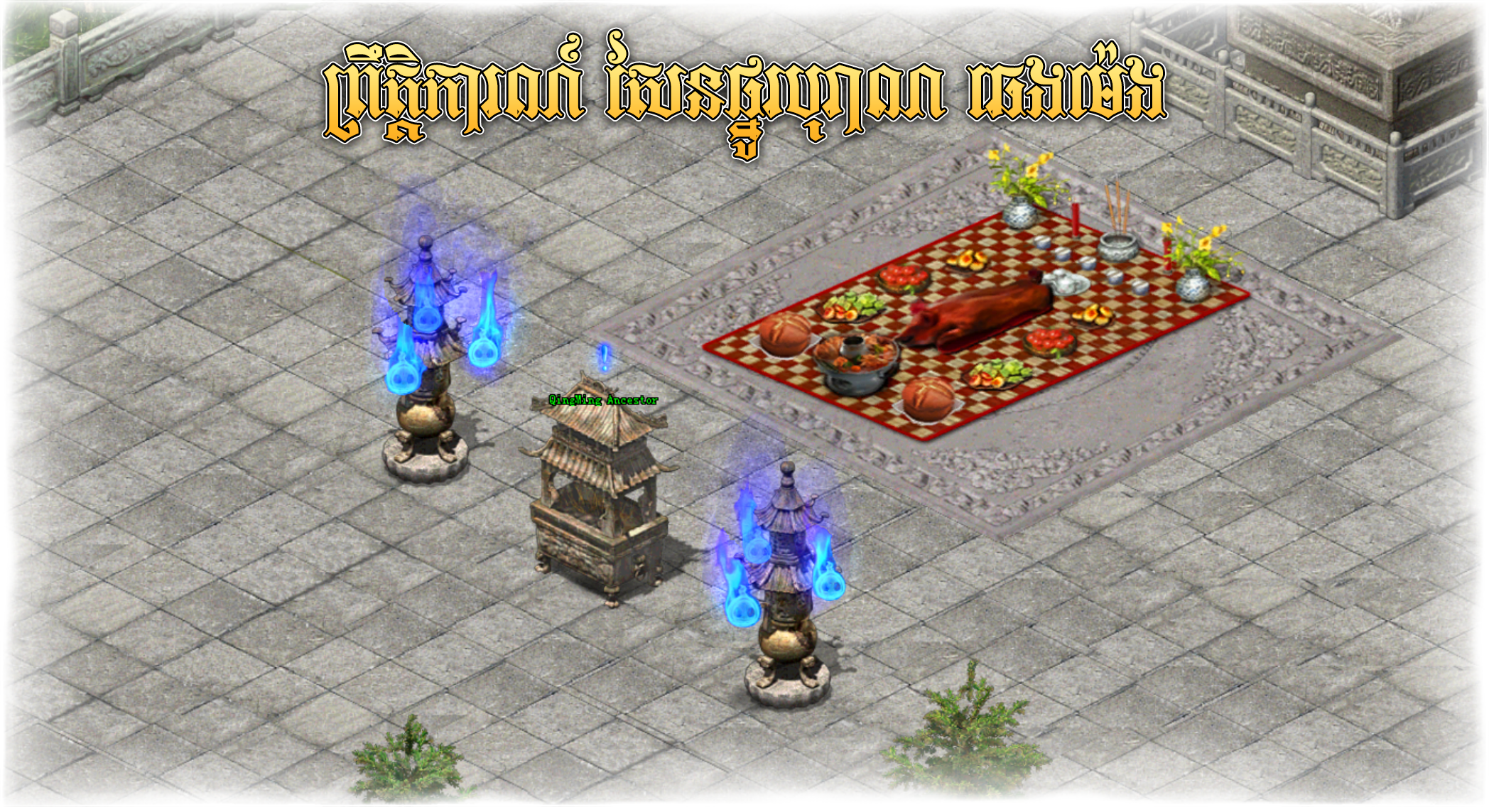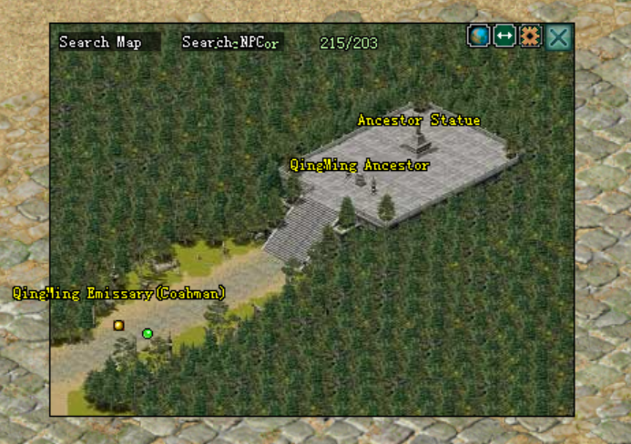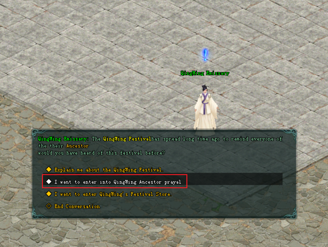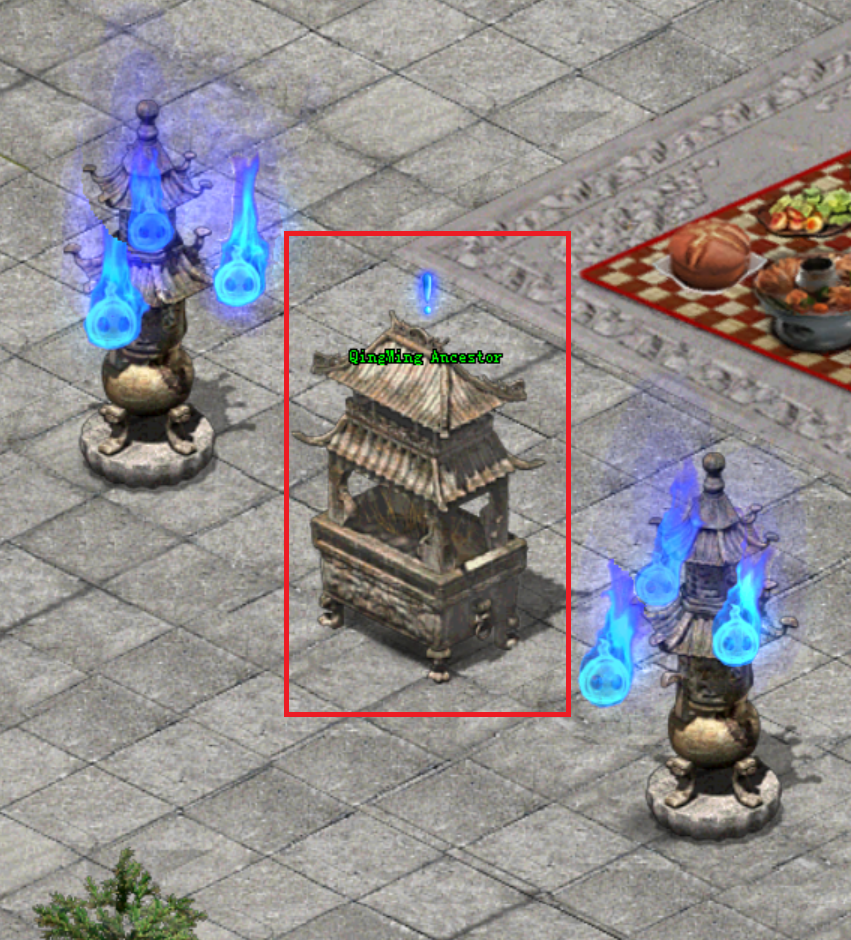 ● នៅពេលតួអង្គរបស់អ្នកកម្សាន្តត្រូវបានបញ្ចូនចូលទៅកាន់ផែនទី Ancestor Tomb អ្នកកម្សាន្តអាចធ្វើការឡើងទៅខាងលើបានតាមកាំជណ្ដើរនឹងបានឃើញ នៅ ថូ ធំ ដែលមានឈ្នោះថា QingMing Ancestor ដែលជាទីកន្លែងសែនព្រេន ។