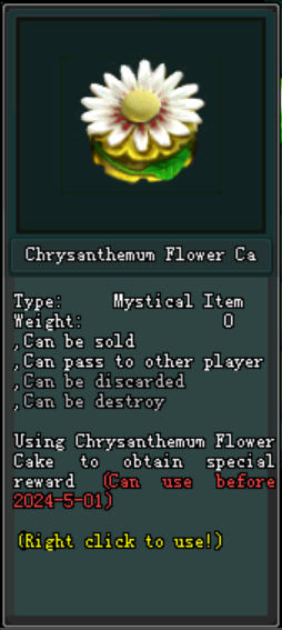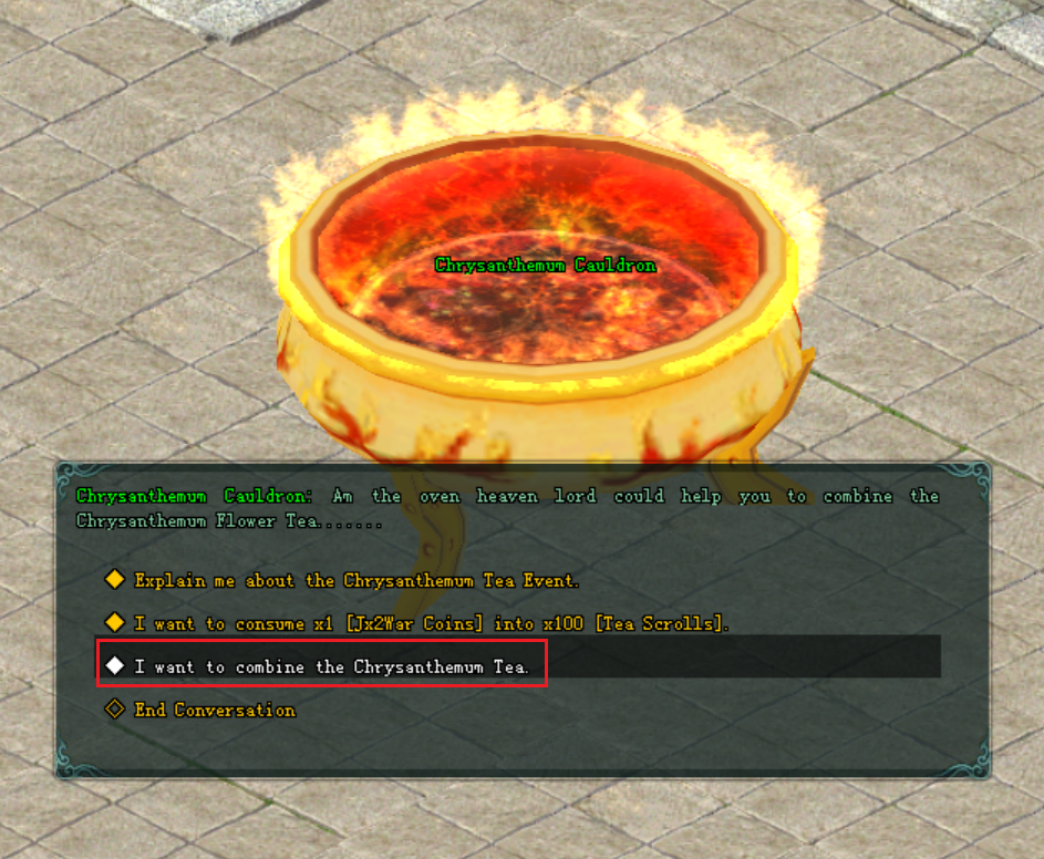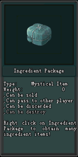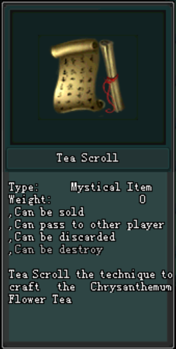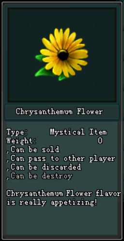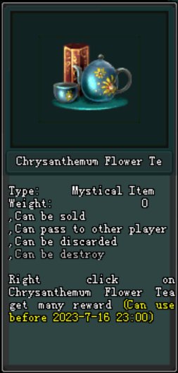 ក្រោយពេល Maintenance Version 2.0.7 រួចមកអ្នកកម្សាន្តដែលធ្វើការ ចូលរួមព្រឹត្តិការណ៍កំចាត់មេនិងទទួលបាន Ingredient Package នៅពេលដែលអ្នកកម្សាន្តទទួលបាន កញ្ចប់ Ingredient Package អ្នកកម្សាន្តអាចបើកវាបាននិងទទួលបាននូវ សម្ភារៈដើម្បីផលិតបាននូវ Chrysanthemum Flower Tea ដែលនៅក្នុងនោះរួមមាន : Chrysanthemum Flower និង Waterfall Water