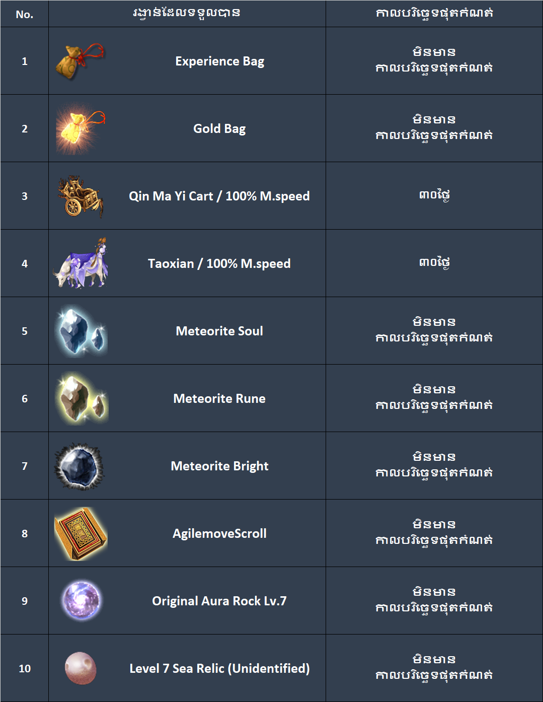 និងរង្វាន់ Random ក្នុងតារាងខាងក្រោម:
