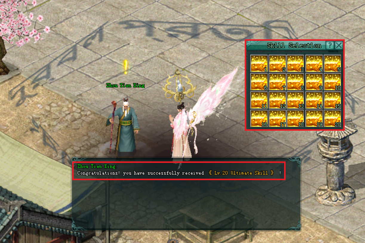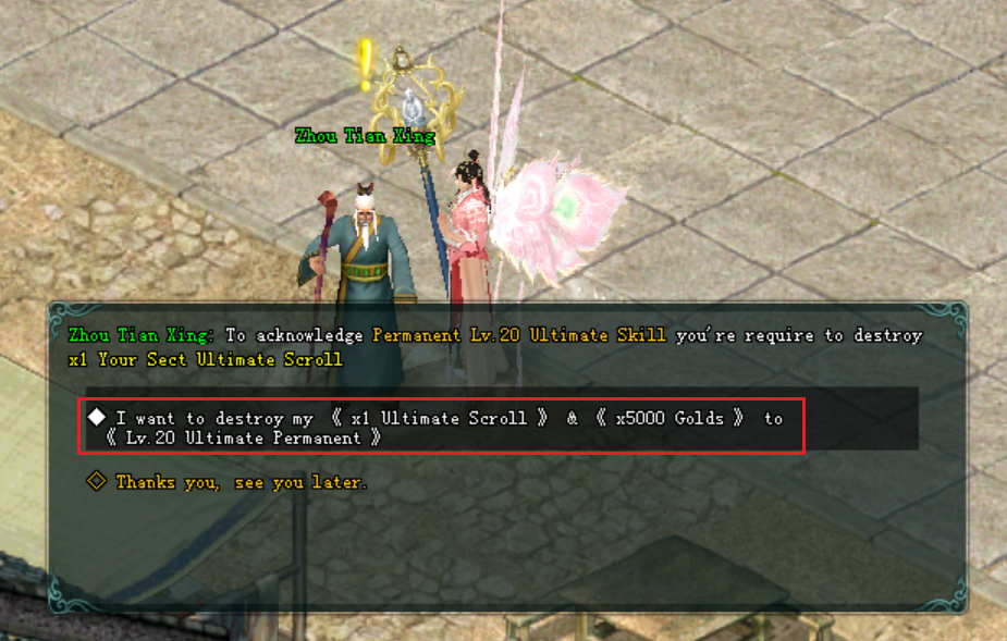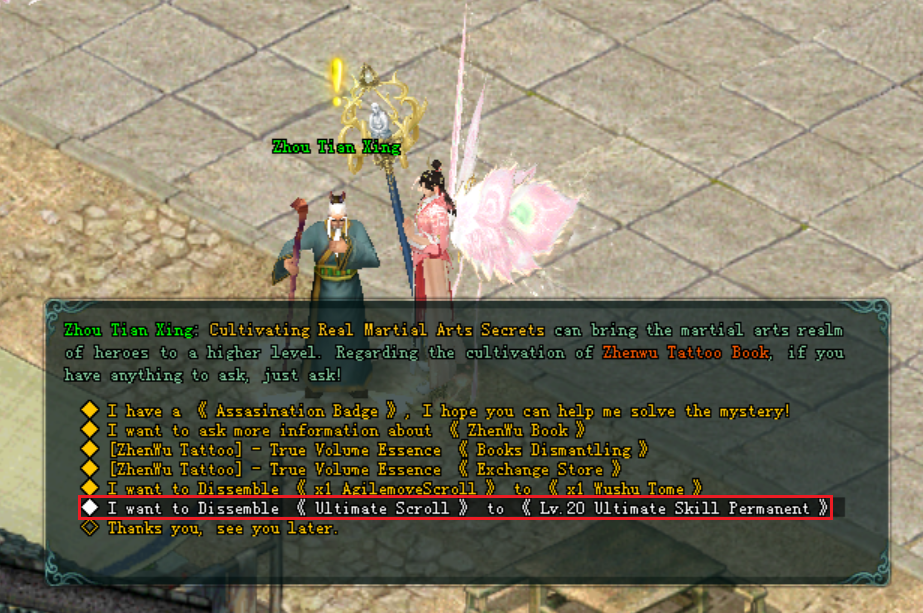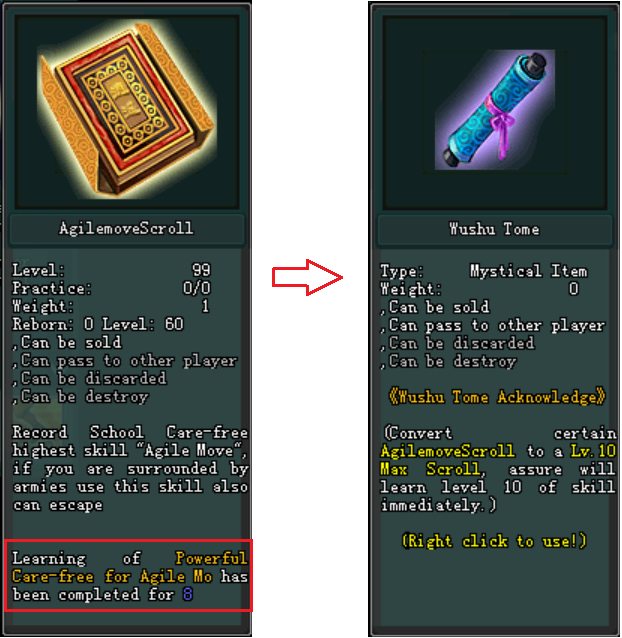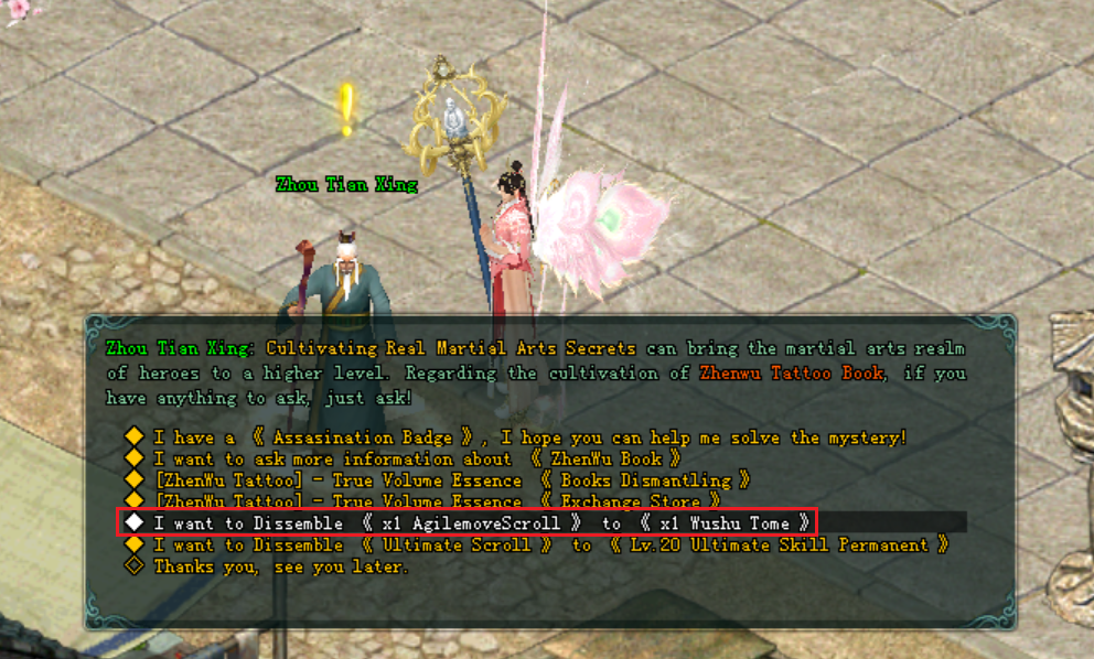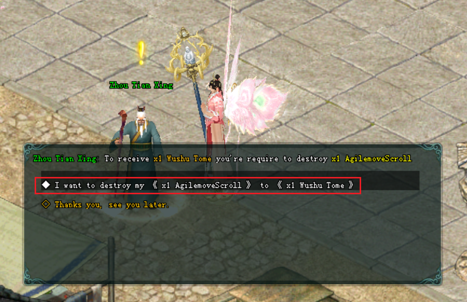 - អ្នកកម្សាន្តអាចធ្វើការ ប្ដូរ AgilemoveScroll ជាមួយ នឹង NPC Zhou Tian Xing បាន ដើម្បីទទួលបាន Wushu Tome ចំនួន 1 សន្លឹក។