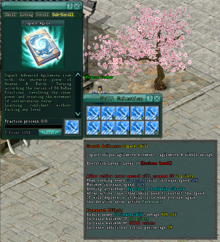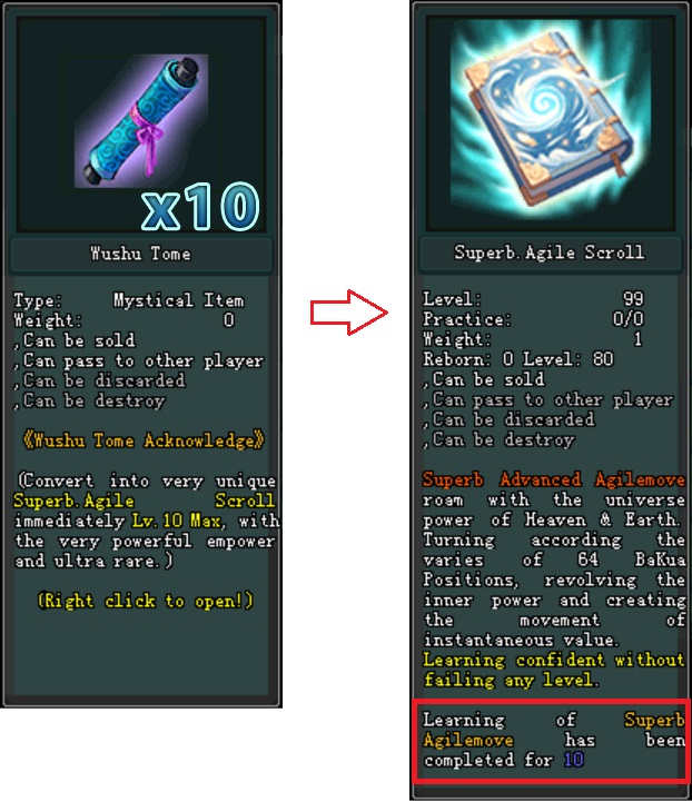 - ក្នុងការសន្សំ Wushu Tome គ្រប់ចំនួន 10 សន្លឹក អ្នកកម្សាន្ត នឹង អាចធ្វើការ បើកយក Superb.Agile Scroll ដែលរៀនរួចរាល់ គ្រប់ចំនួនកម្រិត Lv.10 ពេញ