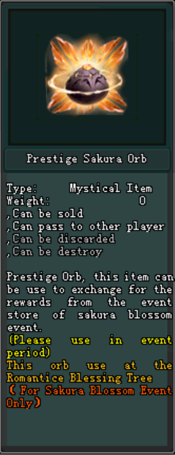 នៅពេលដែលអ្នកកម្សាន្តចូលរួមព្រឹត្តិការណ៍នេះ អ្នកកម្សាន្តក៏នឹងទទួលបាន នូវ Prestige Sakura Orb