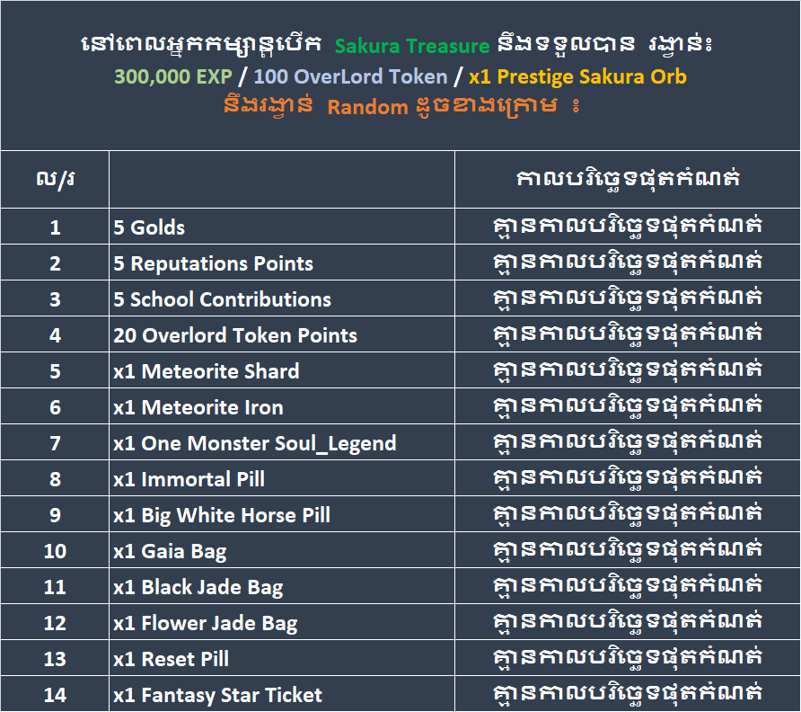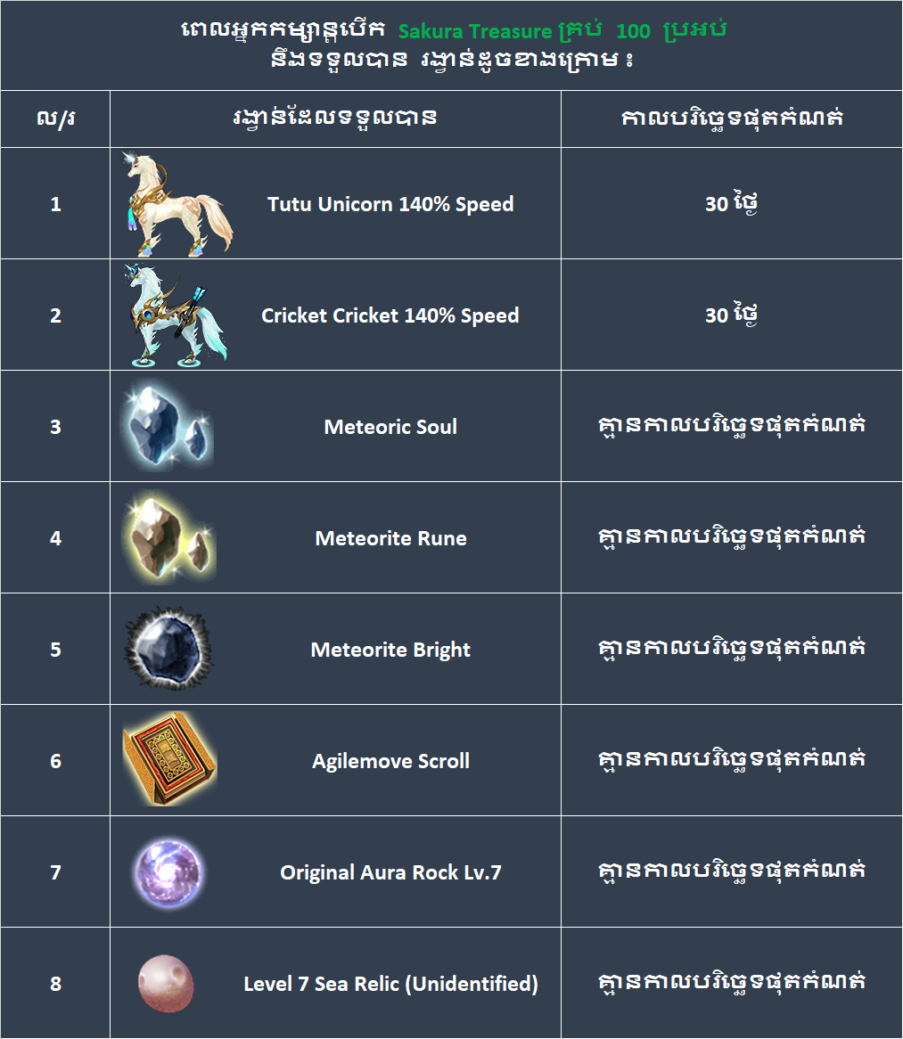 នៅពេលអ្នកកម្សាន្ត បើក Sakura Treasure គ្រប់ 100ដង នឹងមានឳកាសទទួលបានរង្វាន់បន្ថែមពិសេសដូចខាងក្រោម ៖