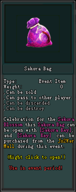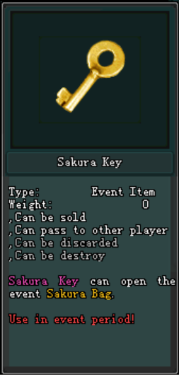 អ្នកកម្សាន្តអាចបើក Sakura Bag បានតម្រូវអោយមាន Sakura Key ចំនួន 1 បន្ទាប់ពីអ្នកកម្សាន្តបំបែក Sakura Bag នេះ នឹងទទួលបានភ្លាមៗ៖