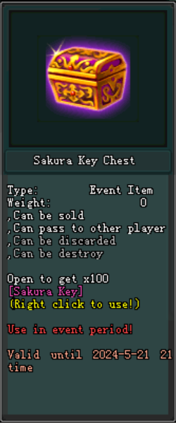 - Sakura Key Chest អាចរកទិញបាន ក្នុងតម្លៃ 89 Jpoints បើកទទួលបានចំនួន x100 Sakura Key ។
