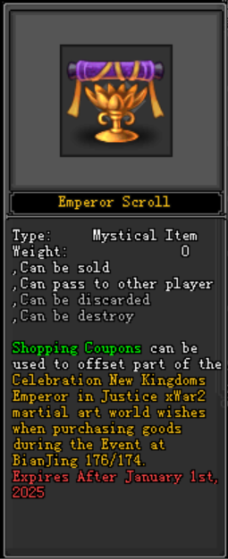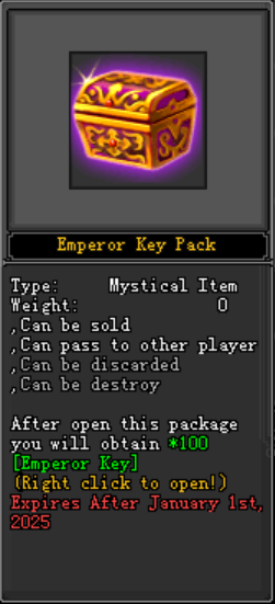- នៅពេលអ្នកកម្សាន្តរើស ប្រអប់ អ្នកនឹងទទួលបានភ្លាមៗនូវរង្វាន់ដូចខាងក្រោម៖ Experience: 200,000 EXP, Emperor Scroll x1