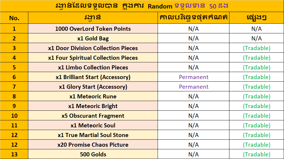 ក្នុងករណីបើក 50 ដង និងអាចទទួលបានរង្វាន់មួយដូចខាងក្រោម៖