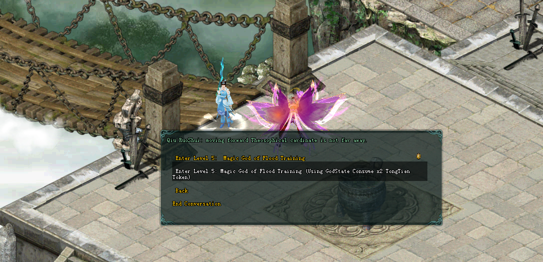 The captain talks with NPC Qiu RuoShui to continue the opening of the fifth stage - Magic God of Flood Training .