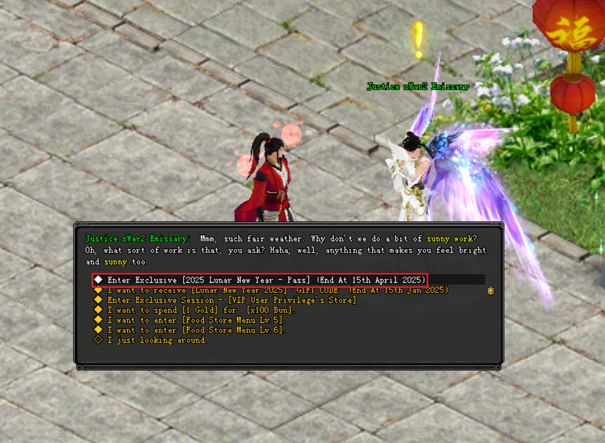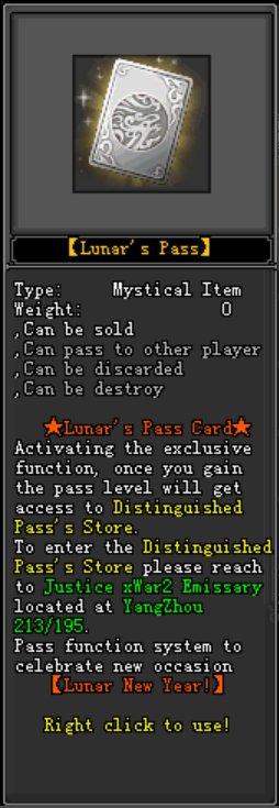 អ្នកកម្សាន្តអាចធ្វើការ ស្វែងរក Exclusive Pass's Store បានជាមួយនឹង NPC Justice xWar2 Emissary ដែលមានទីតាំងនៅក្រុង YangZhou 213/195។