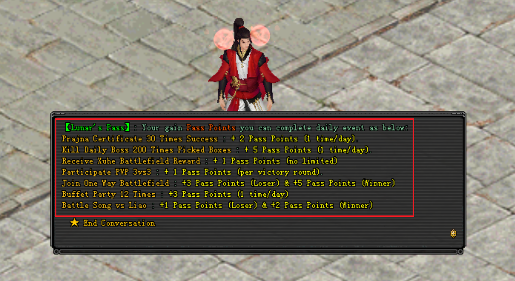 ●ការចូលរួម ព្រឹត្តិការណ៍ Song vs Liao Battlefield ហើយទទួលយក Reward នឹង ទទួលបាន 1 ពិន្ទុ Pass Points សម្រាប់អ្នកចាញ់ និង ទទួលបាន 2 ពិន្ទុ Pass Points សម្រាប់អ្នកឈ្នះ ក្នុង ជុំនិមួយៗ ៖