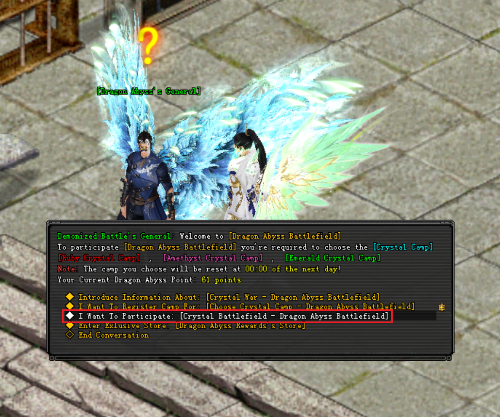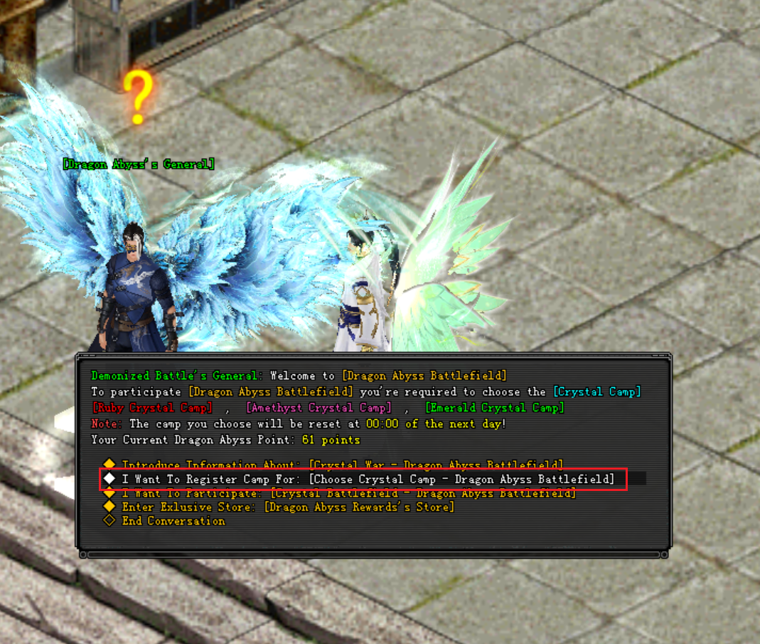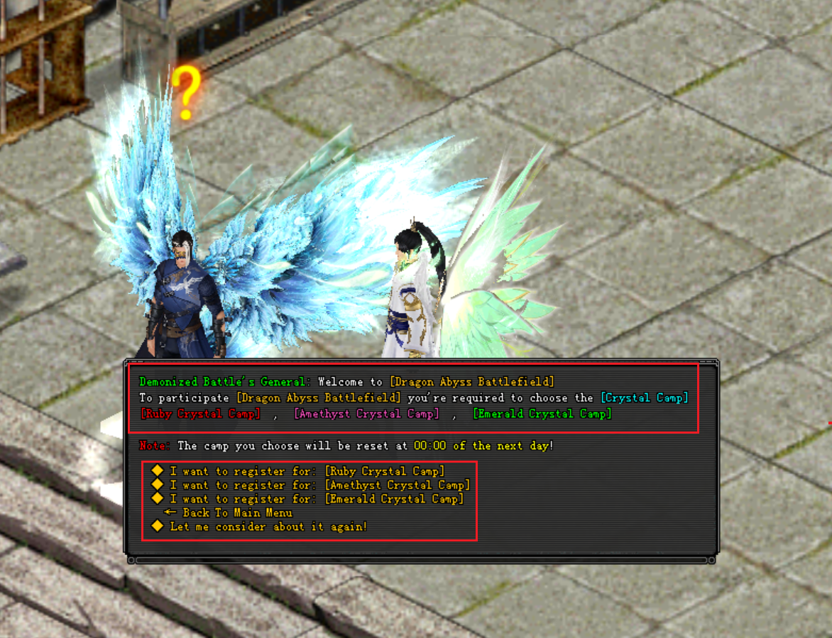 ● ដើម្បីធ្វើការចុះឈ្មោះត្រូវជួបជាមួយ NPC: Dragon Abyss's General នៅឯ ChengDu [228/222]។
