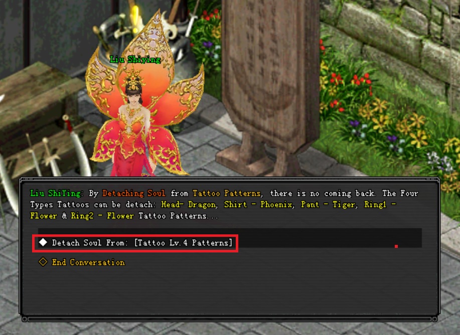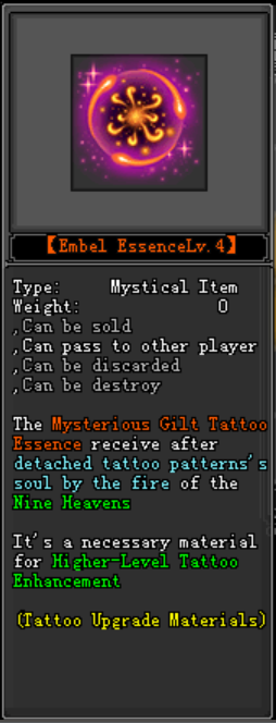 - បន្ទាប់ពីអ្នកកម្សាន្ត បានទទួលនូវ Embel Essence Lv.4 ដែលបានពីការ Detach Soul - Tattoo Patterns Level 4 ពី NPC:【 Liu Shiying 】មក