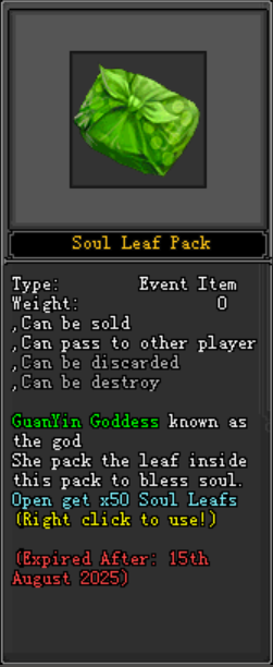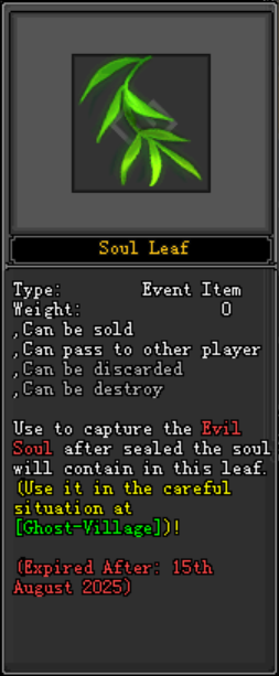 - សម្ភារៈគួរមានសម្រាប់ព្រឹត្តិការណ៍៖ Soul Leaf អ្នកកម្សាន្តអាចទិញ Soul Leaf បានដែលមានតម្លៃ 119 Jpoints នៅក្នុង Jx2War Mall