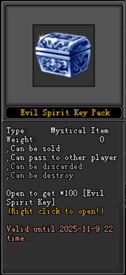 អ្នកកម្សាន្តអាចបើក Evil Spirit Chest បានតម្រូវអោយមាន Evil Spirit Chest x1 បន្ទាប់ពីអ្នកកម្សាន្តបំបែក Evil Spirit Chest នេះ នឹងទទួលបានភ្លាមៗ៖