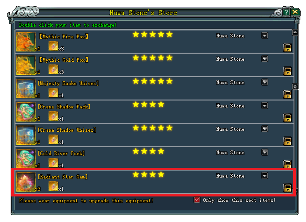 - ដោយ [Nuwa Stone] ១គ្រាប់ អាចធ្វើការប្ដូរ [Radiant Star Gem] បានចំនួន ៣ គ្រាប់។